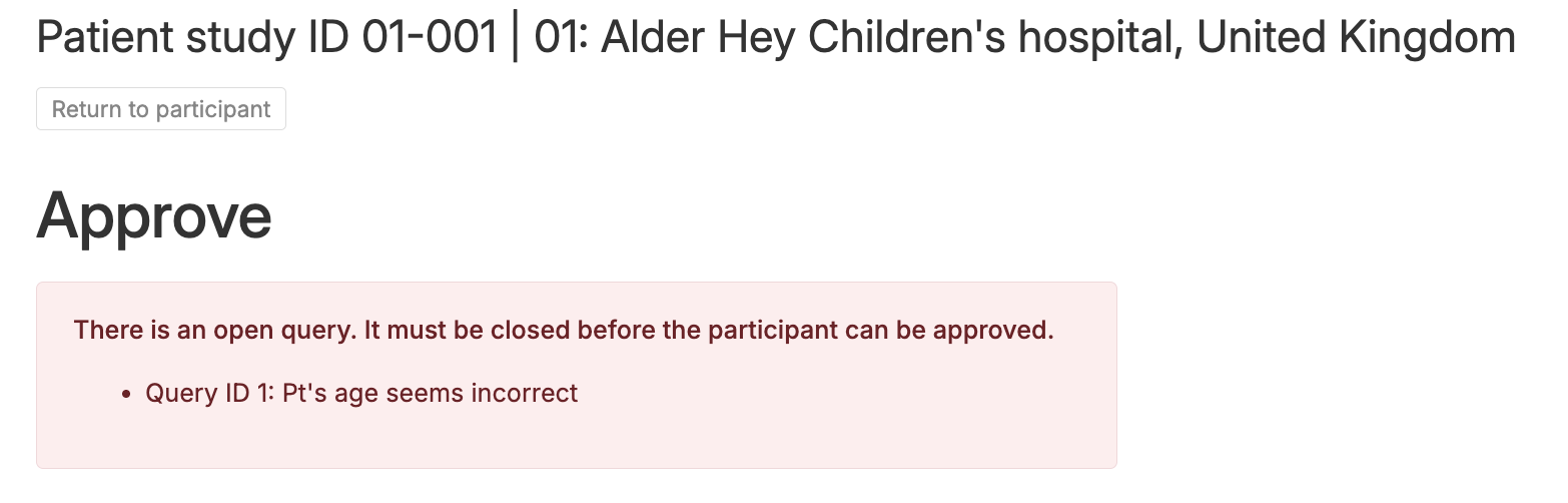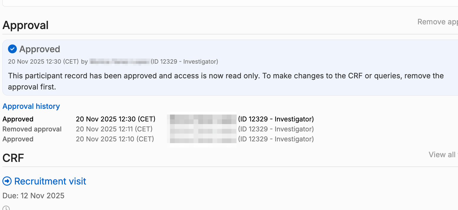 - When the CRF has been approved, forms and queries become read-only. Approval can be removed (and forms/queries will become editable again) by clicking on the "Remove approval" link.