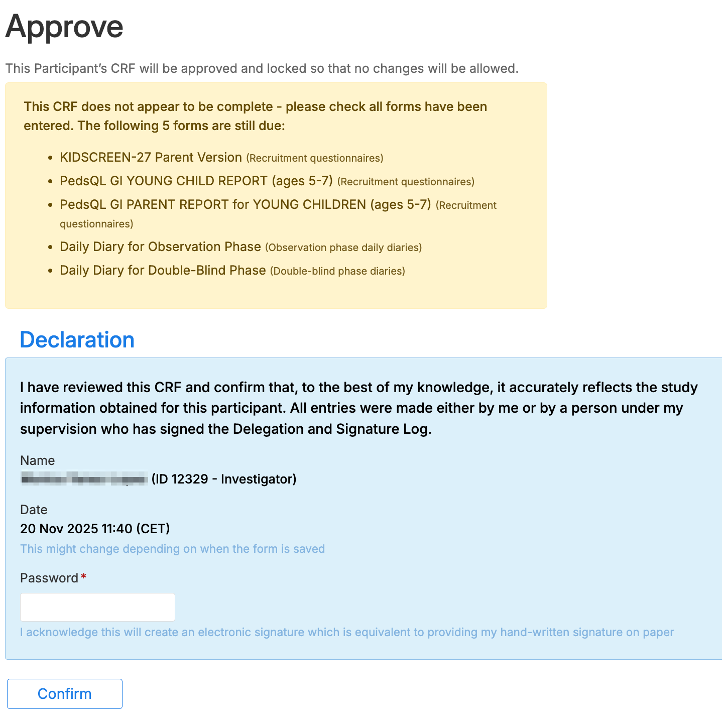 - Once all queries have been closed, the CRF can be approved. A list of overdue forms is shown. The user needs to enter their password to approve the CRF.